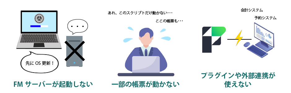 FileMakerのバージョンアップで多いトラブルには、次のようなものがあります。